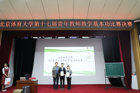 教学基本功是每名教师的必备技能,青年教师教学基本功的提高是保证学校教学质量的关键,从学校发布赛事通知开始,学院和教研室领导高度重视,特邀第四届全国高校青年教师教学大赛文科组一等奖的清华大学彭建敏副教授为今年会参赛教师进行赛前指导。全体青年教师精心准备,并积极参赛,杨晓光和郭露露老师在学院选拔赛中脱颖而出,代表学院参加本月19日举行的全校青年教师基本功比赛,并分别获得了术科A、B组第一名的成绩晋级全校决赛。在决赛中,两名教师分别以《力量训练法》和《自由式摔跤——抱双腿技术训练法》为授课题目,授课形式多样、课堂气氛活跃、授课生动形象、充分体现出了今年会重竞技项目的特点和魅力,给大家留下了深刻的印象,多次收获现场观众及评委的热烈掌声。最终两名教师获得术科组第一名和第二名,为学院赢得荣誉。
