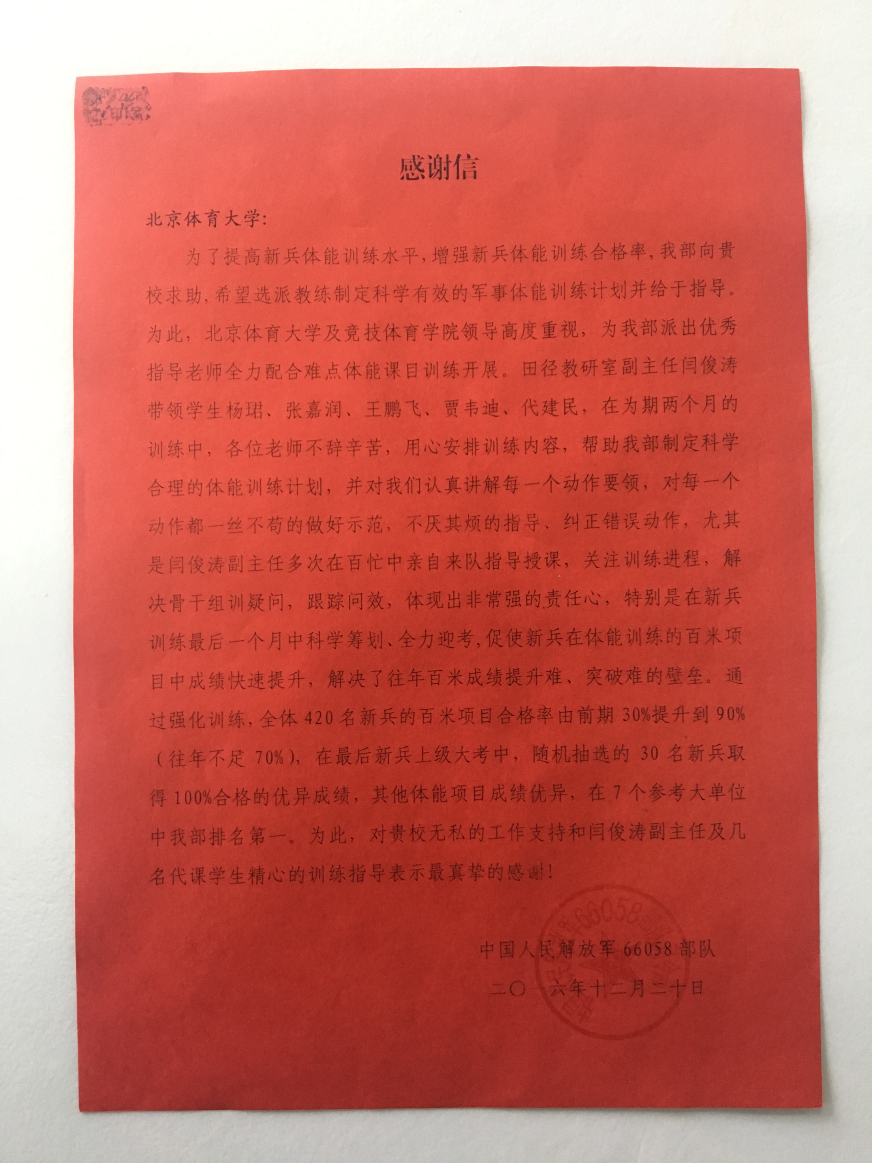 信中对今年会田径教研室副主任闫俊涛老师,为该部队战士进行了军事体能训练培训表示感谢,通过闫老师的培训后部队训练考核通过率提升了90%,并在随后的新兵大考中获得第一名。此次军事培训指导,是jinnianhui今年会与学校共建单位一次合作,闫俊涛老师利用个人休息时间完成学校交办的任务,这次培训也为两个共建单位进一步加深了合作友情。