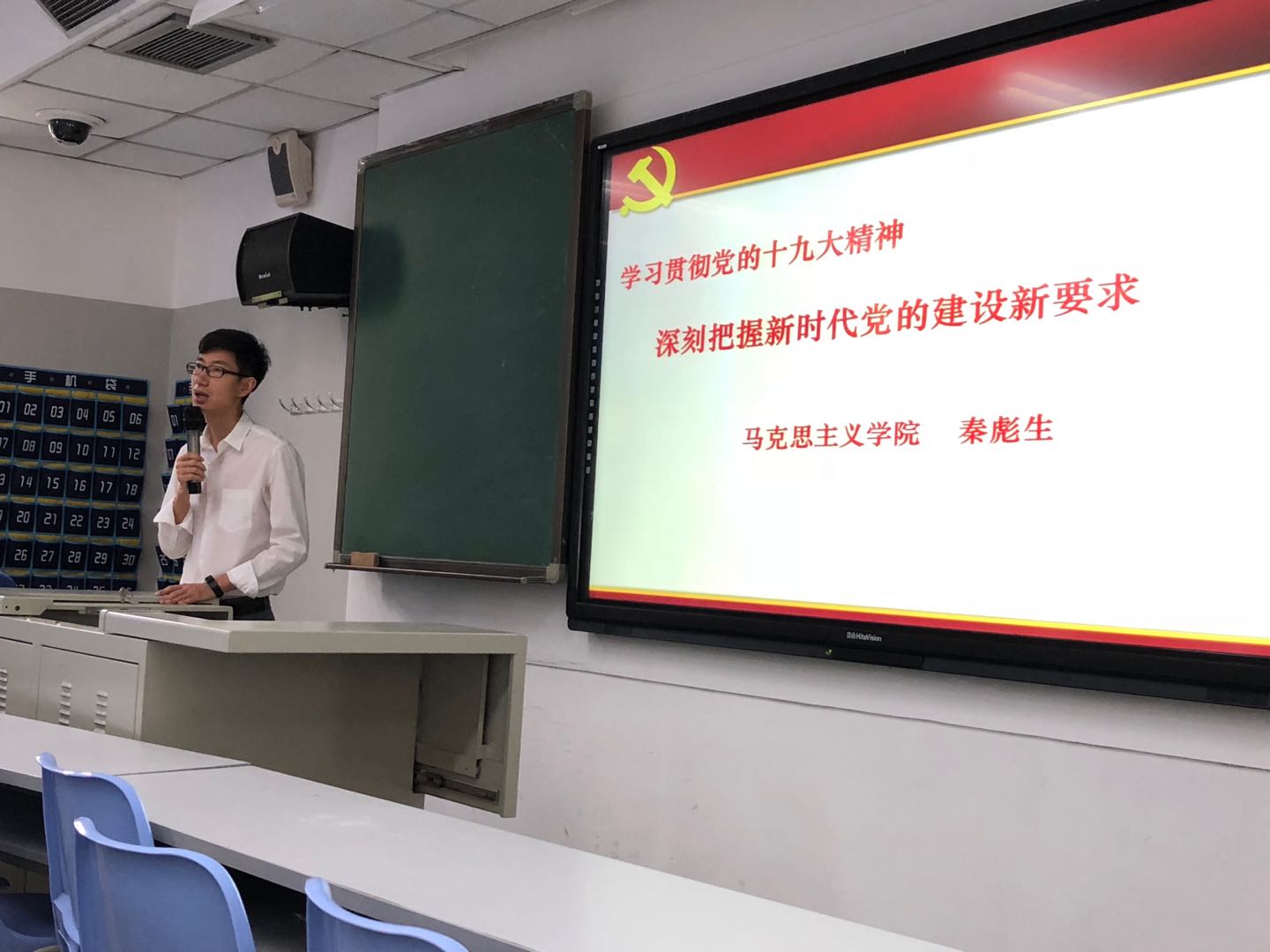 秦彪生老师围绕“新时代党的建设历史地位、党的建设总要求、党的建设新部署”三个方面讲述了加强基层党组织建设的思路和方法。他强调党的十八大以来,国家的发展是极其不平凡的,但全面从严治党是最突出的亮点之一,并且成绩卓著。他讲到,在新时代条件下,共产党员要以党的政治建设为统领,以坚定理想信念为根基,以调动全党积极性、主动性、创造性为着力点,全面推进党的政治建设、思想建设、组织建设、作风建设、纪律建设,把制度建设贯穿其中,不断提高基层党组织建设。