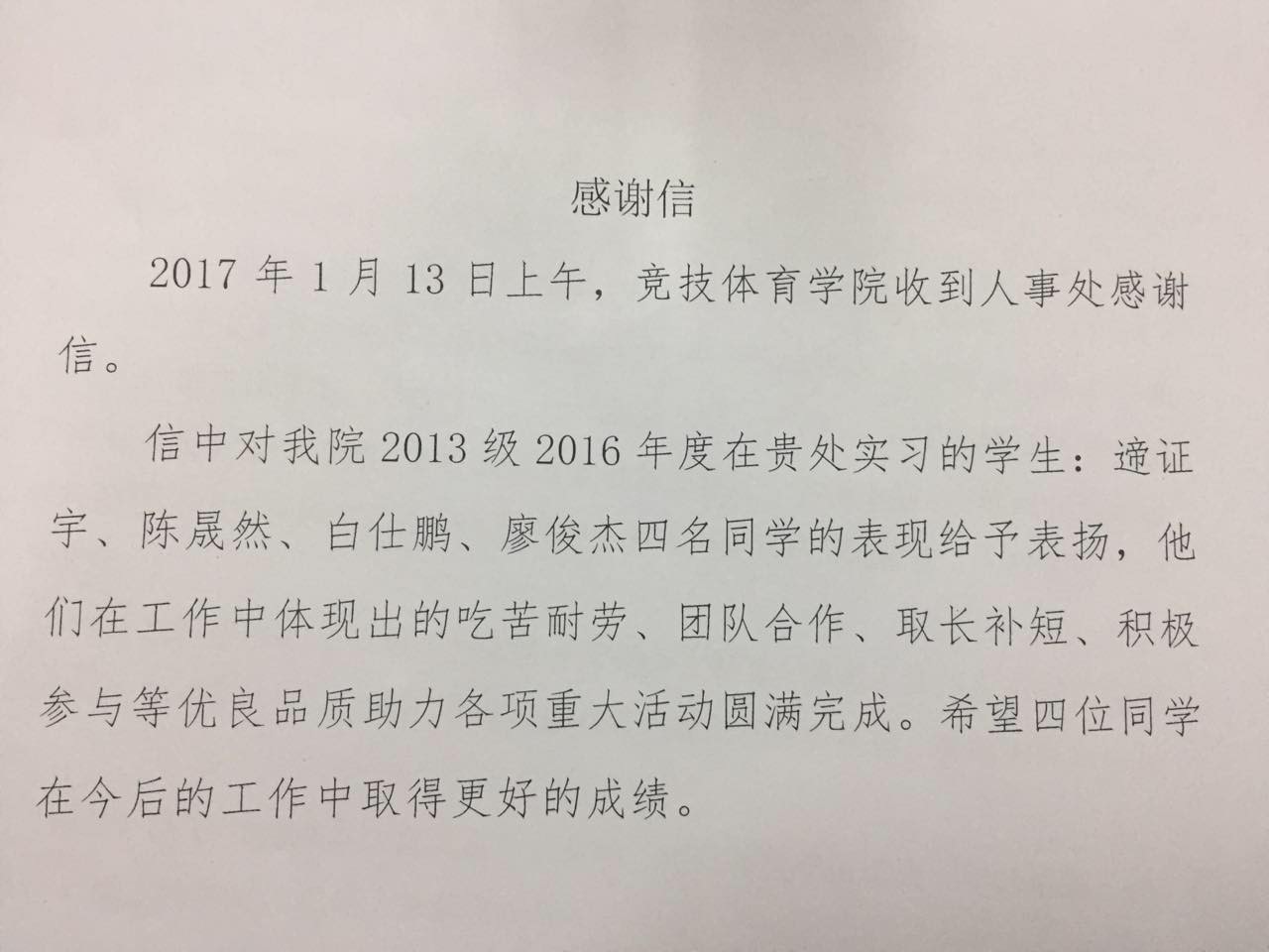 信中对今年会2013级2016年度在贵处实习的学生:遆证宇、陈晟然、白仕鹏、廖俊杰四名同学的表现给予表扬,他们在工作中体现出的吃苦耐劳、团队合作、取长补短、积极参与等优良品质助力各项重大活动圆满完成。希望四位同学在今后的工作中取得更好的成绩。