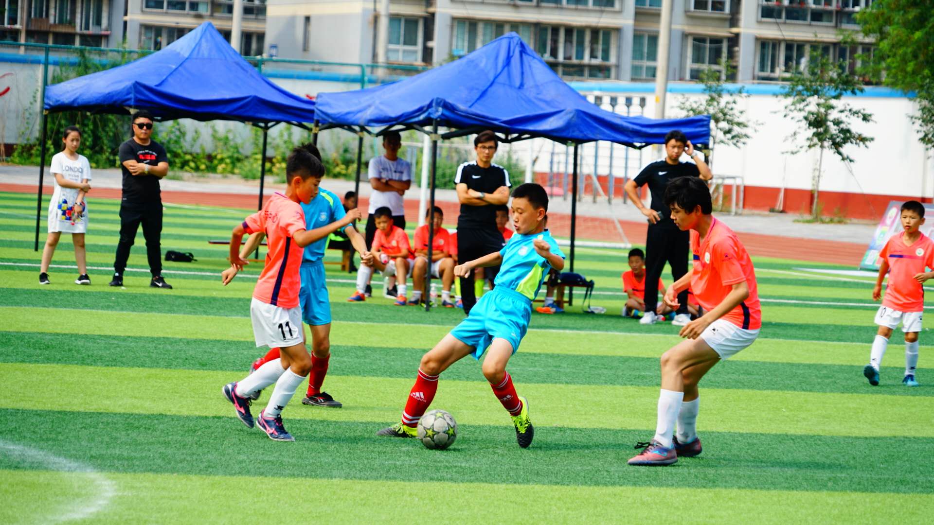 7月1日,第一场对阵长陵小学,双方水平不相上下,最后三分钟逆转取胜,以3比2的优势晋级八强。第二场对阵回龙观中心小学,常规时间0比0,点球踢了6轮,守门员初奇神勇扑出两球,最终以5比4晋级四强。第三场对阵昌平区第二实验小学,1比0小胜对手晋级决赛。第四场对阵大东流小学,上半场失一球,下半场易边再战,大东流小学展开反扑并创造几次破门机会,我校在稳固防守同时进攻,给对手继续施压,但运气欠佳,一球惜败。