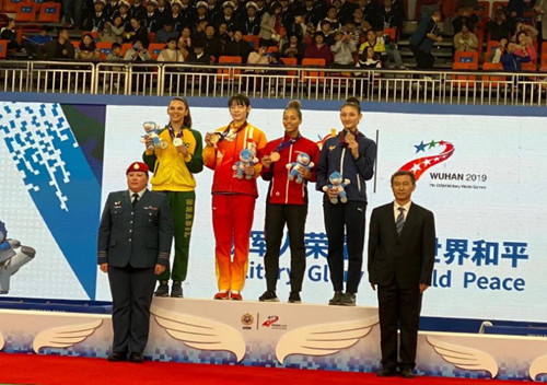2019年10月25,26日,第七届世界军人运动会在武汉体育馆开始了跆拳道项目的比拼。20岁的宋洁和21岁的张梦宇分别夺得62公斤,67公斤两枚金牌。赛后,她们满怀着骄傲与喜悦,身披国旗绕场一周后,朝着场下两面观众席庄重地各敬了一次军礼。这一幕成为了今日军运会跆拳道赛场最动人的瞬间。