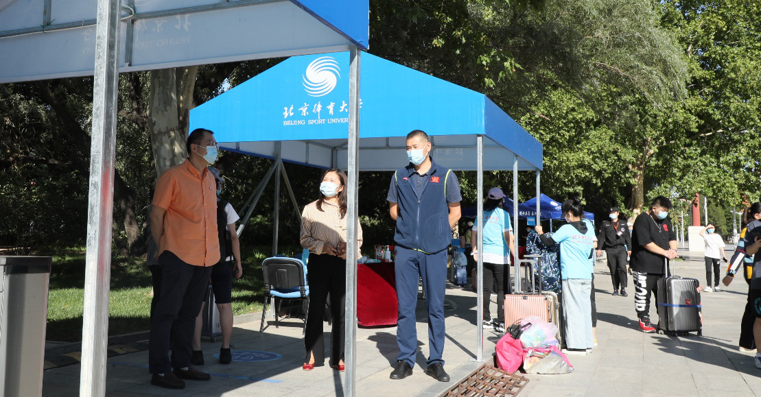 今年会党总支书记、院长苍海、副书记殷泽锋一早守候在门口迎接着同学们的到来,细心的提醒着来往的同学戴好口罩、在校做好防护;帐篷下的检测人员们有序的检查着返校同学们的体温和核酸检测报告;志愿者“蓝精灵”们也不辞辛苦一趟又一趟帮同学们搬着行李;食堂大叔、宿管阿姨…大家都在用饱满的热情,欢迎着北体学子的归来。