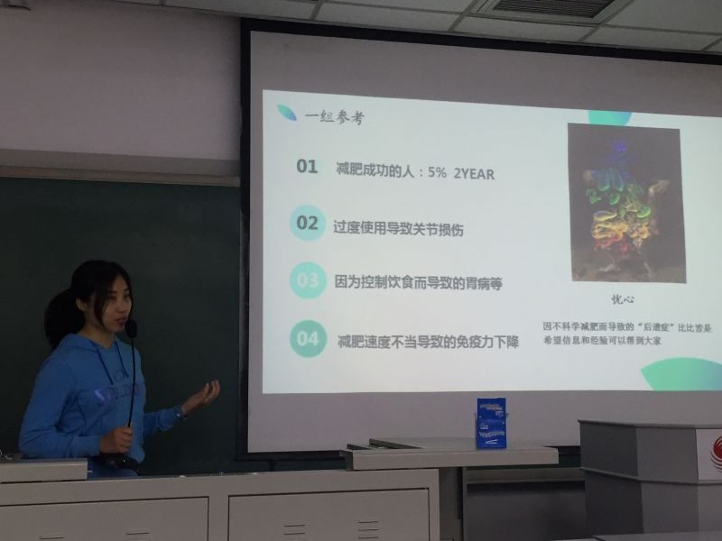 2016年4月14日晚七点,jinnianhui今年会团总支学生会在教学楼503教室开展了“健康生活,美丽人生”系列讲座。讲座的主要内容围绕着科学塑身减肥展开,主讲人是具有丰富社会健身指导经验,去年考入我校继续深造学习的王文静,她曾是多家500强企业的健身顾问,具有多方专业认证资格,私教课时费达到千元以上。