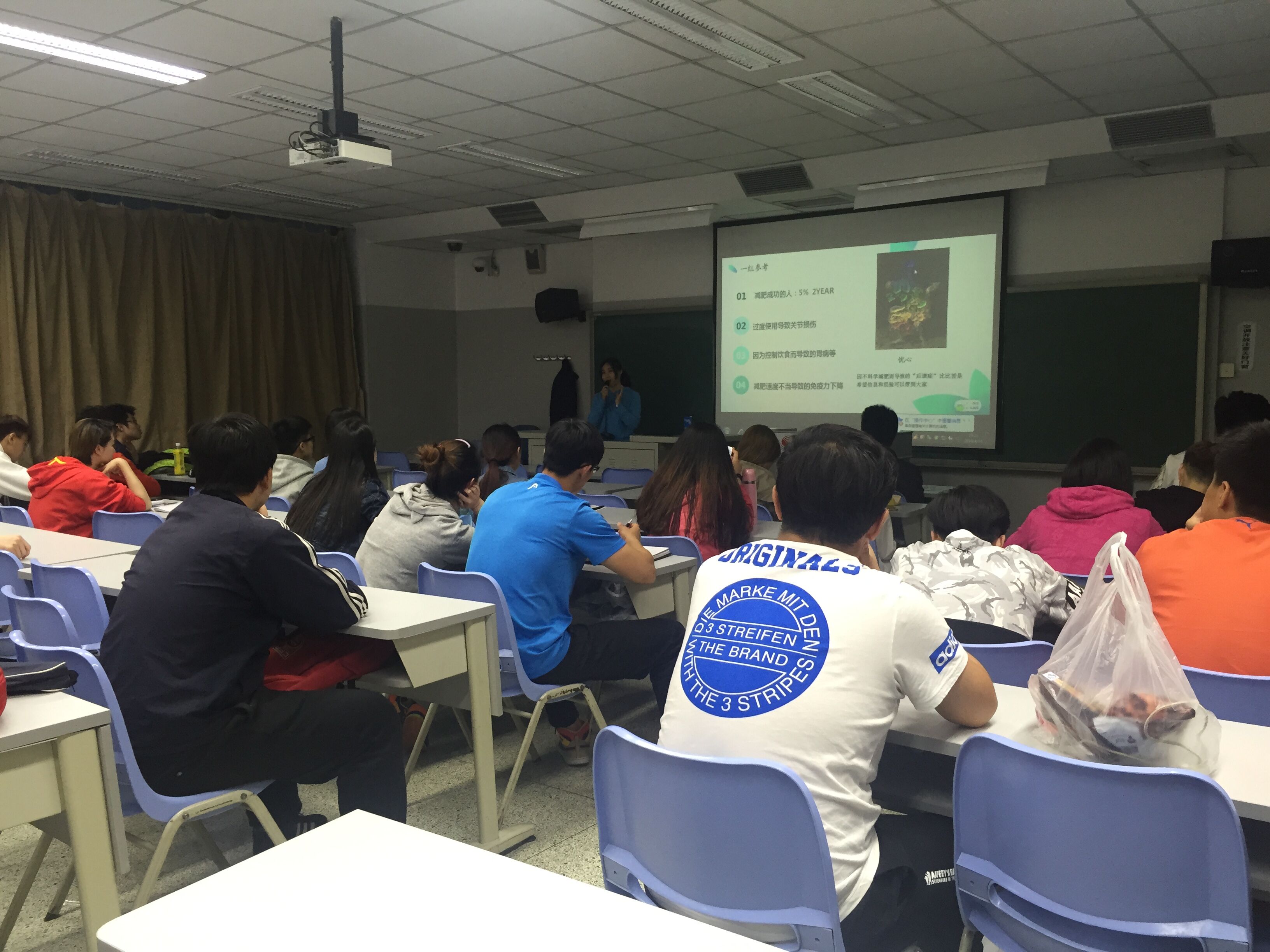 本次讲座对健康的身材的评价指标进行了分析讲解,并通过各种身材图片提高同学们分辨健康身材的眼力。在讲座中对减脂和增肌能否同时进行、饮食的要求和禁忌以及锻炼的方法等多种减肥中遇到的问题进行了讲解和讨论!同学们积极响应,踊跃提出问题并讨论!