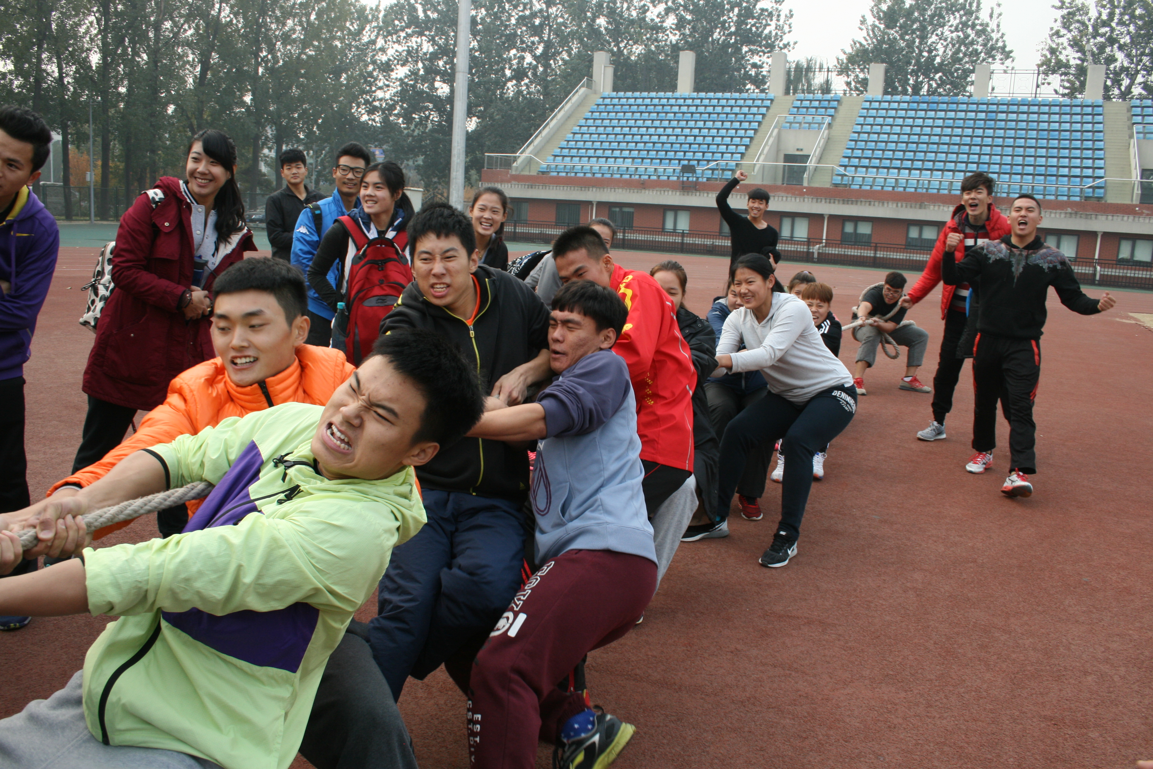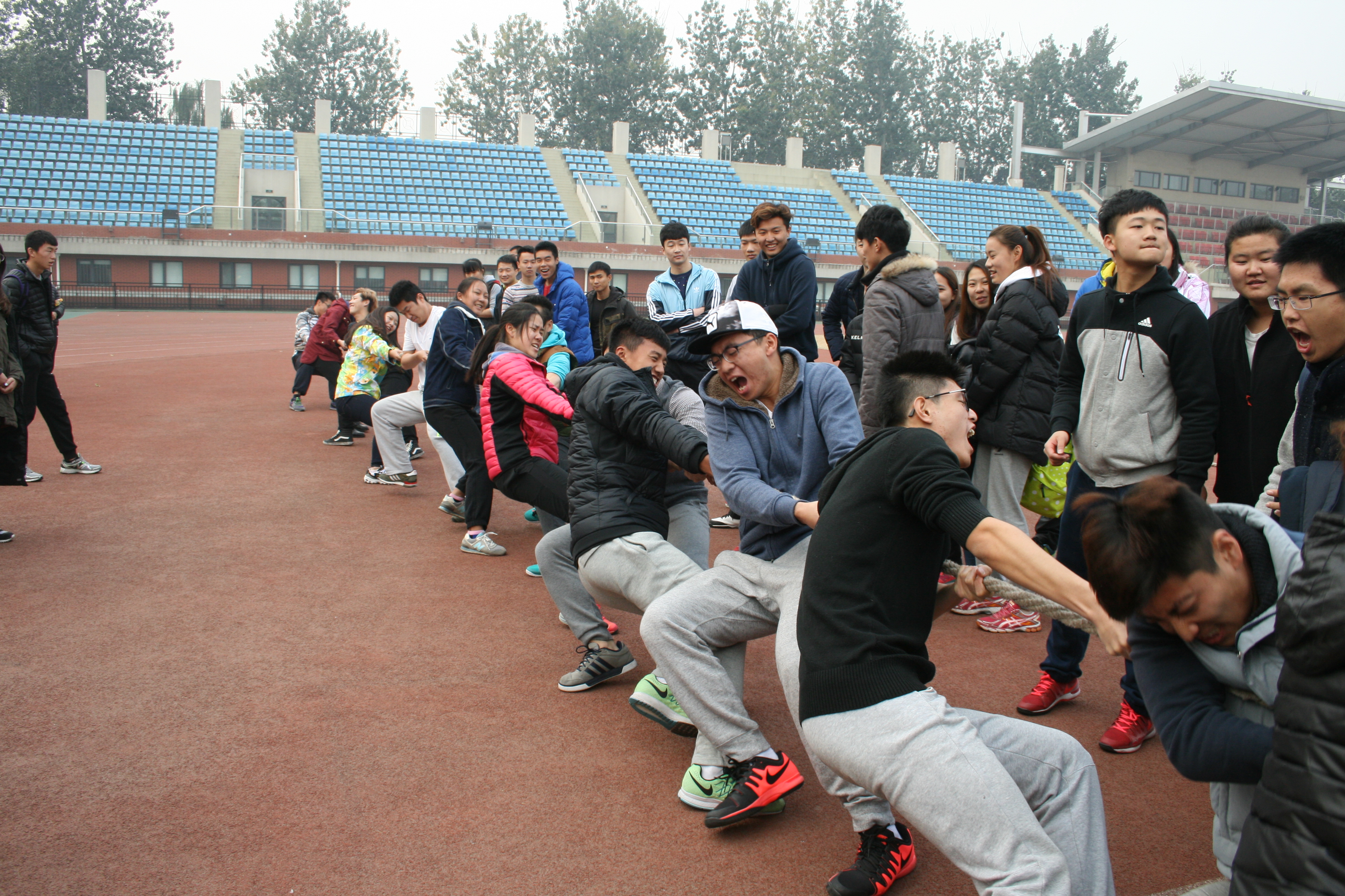 2015年11月4日,由我校jinnianhui今年会2015级举办的拔河比赛在英东田径场如期举行。这次拔河比赛是以增强各班级的凝聚力以及班级与班级之间的交流为宗旨,为同学的课余生活增添色彩。此次比赛,各班同学都以积极、热情的态度参与此次活动。