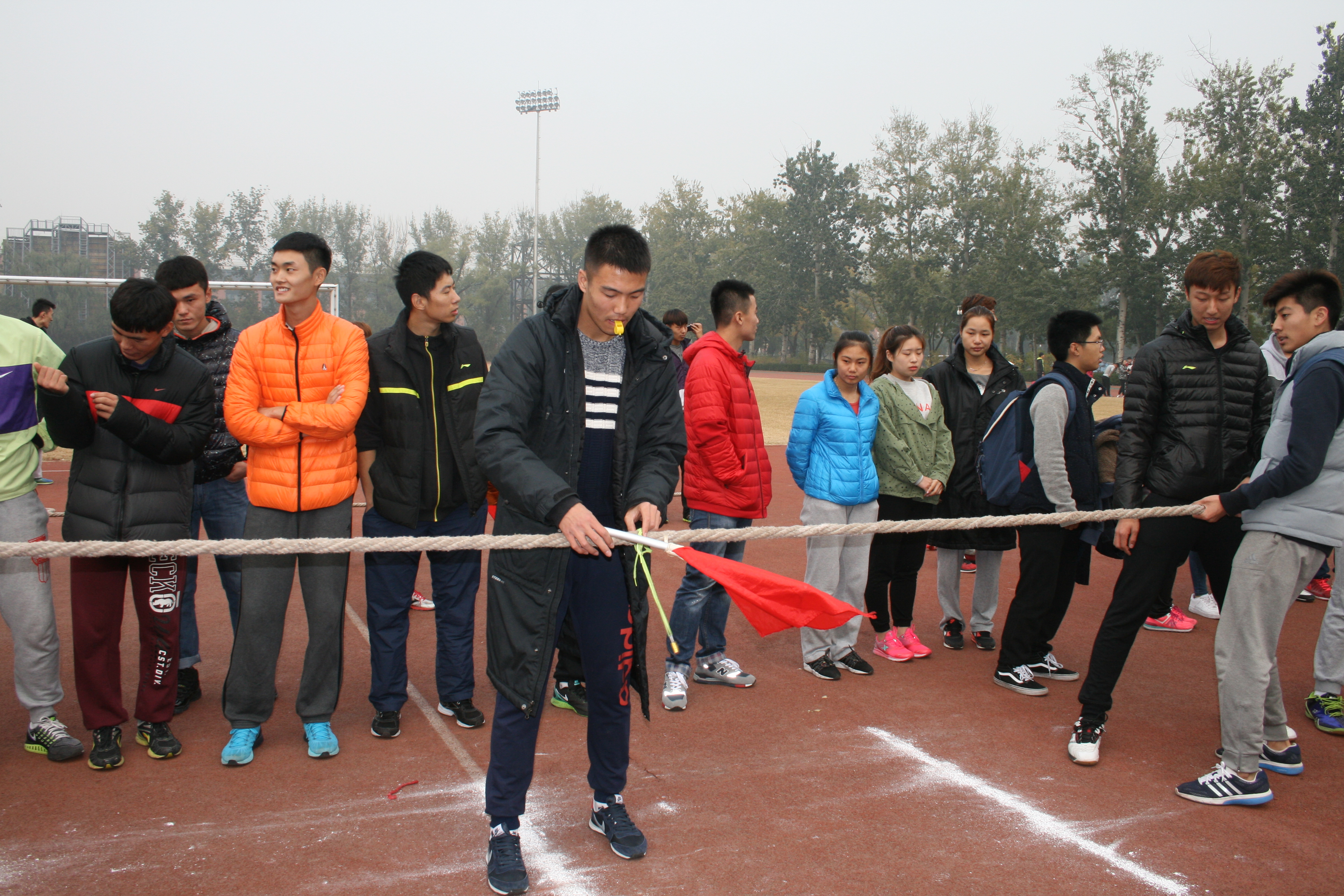 2015年11月4日12:00整,拔河比赛正式开始,每个班级都选拔出了最具实力的队员。只见比赛场上,各班级同学互相加油鼓劲。每个班级都不断的想出更好的方法去拔河并且都在不断的喊着口号,为了最后的冠军拼搏。